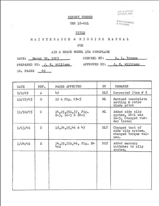 $46.00| /Air & Space Model 18A Gyroplane Maintenance & Rigging Manual 1965 (Report No. UER 18-601)Air & Space30 March 1965 Report No. UER 18-601 Model 18A Gyroplane Maintenance & Rigging Manual $46.00| /Sale