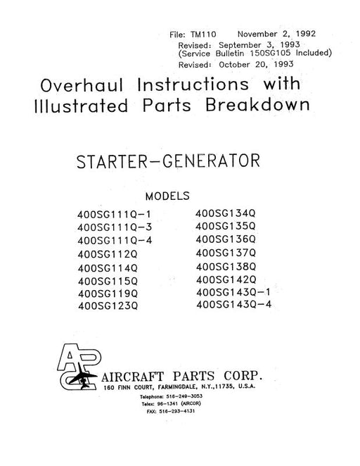 $46.00| /Aircraft Parts Corp. Starter-Generator 1992 Overhaul Instructions with Illustrated Parts (TM110)Aircraft Parts Corp.Revised Oct. 1993 400SG Series $46.00| /Sale