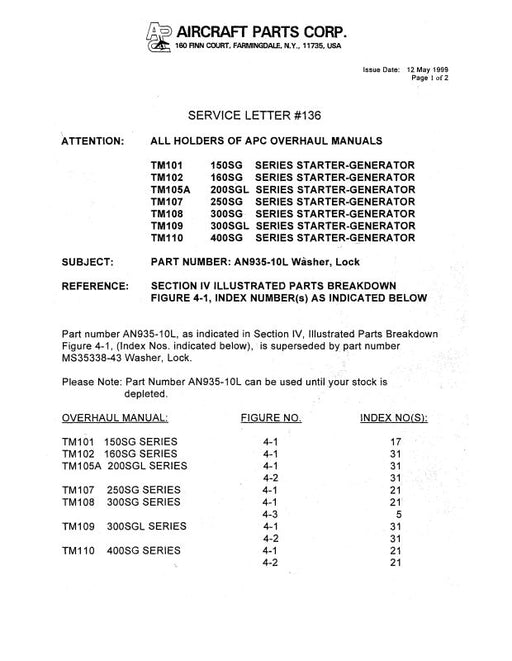 Sale $20.00| /Aircraft Parts Corp. Service Bulletins 1996 Service Letters, Bulletins (SB150SG105)Aircraft Parts Corp.$20.00| /Sale