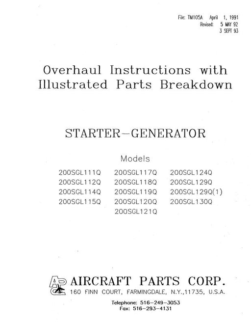 $40.00| /Aircraft Parts Corp. Starter-Generator 1991 Overhaul Instructions with Illustrated Parts (TM105A)Aircraft Parts Corp.Revised Sept. 1993 200SGL Series $40.00| /Sale