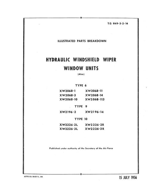 AlcoHydraulic Windshield Wiper Window Units Type 6 XW2068-1 thru wx2068-113, Type 9 XW2196-2, -14, Type 10 XW2226-2L thru XW2226-3R 1956