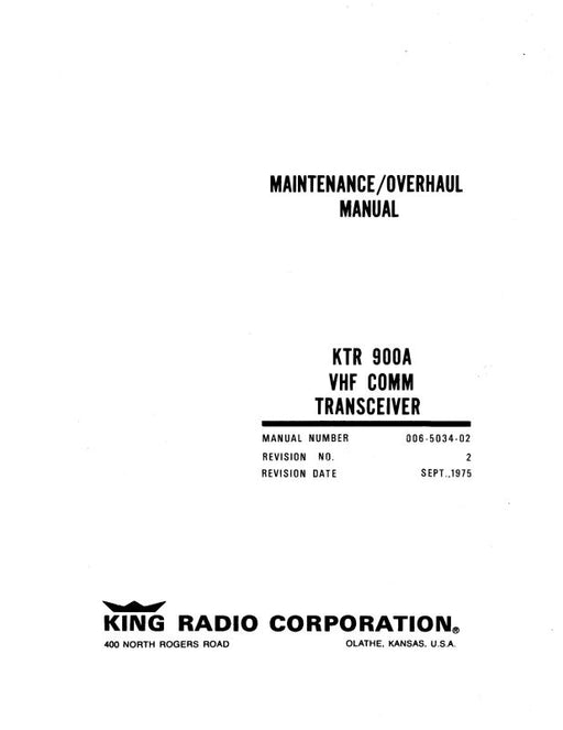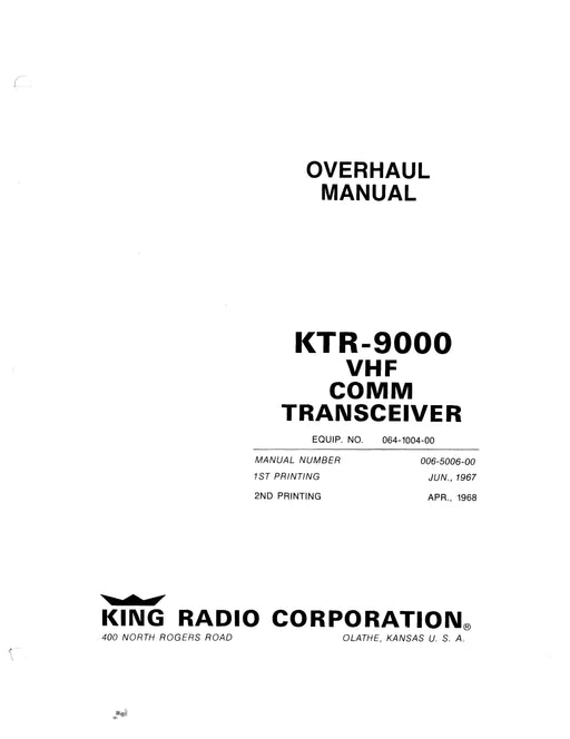 KingKTR-900 VHF COMM Transceiver Equipment No. 064-1004-00, Manual Number 006-5006-00, 2nd Printing April 1968 Table of Contents: Description and Opera...