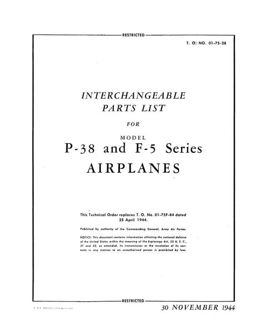 Sale $138.00| /Lockheed P-38 & F5A Series 1944 Interchangeable Parts List Manual (T.O.NO.01-75-28)