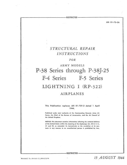 $94.00| /Lockheed P-38 SER thru P-38J-25 1944 Structural Repair Instructions (01-75-3A)