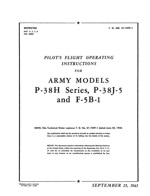 $15.00| /Lockheed P-38H, P-38J-5, F-5B-1 1943 Pilot's Flight Operating Instructions (01-75FF-1)