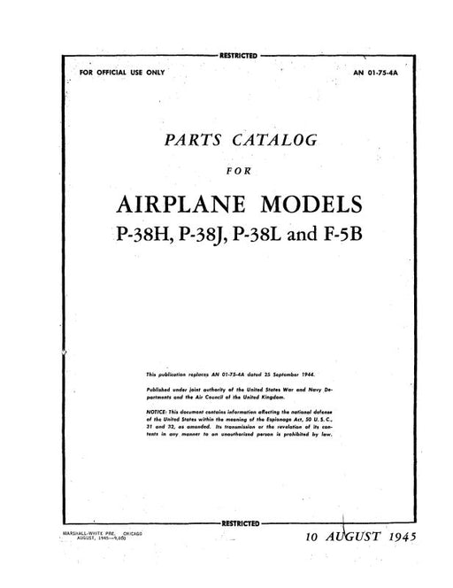 Lockheed MilitaryParts Catalog P-38H, P-38J, P-38L and F-5B Dated August 1945 AN 01-75-4A Basic Weight Check List and Loading Data F-5E Dated March 1945 AN-0...