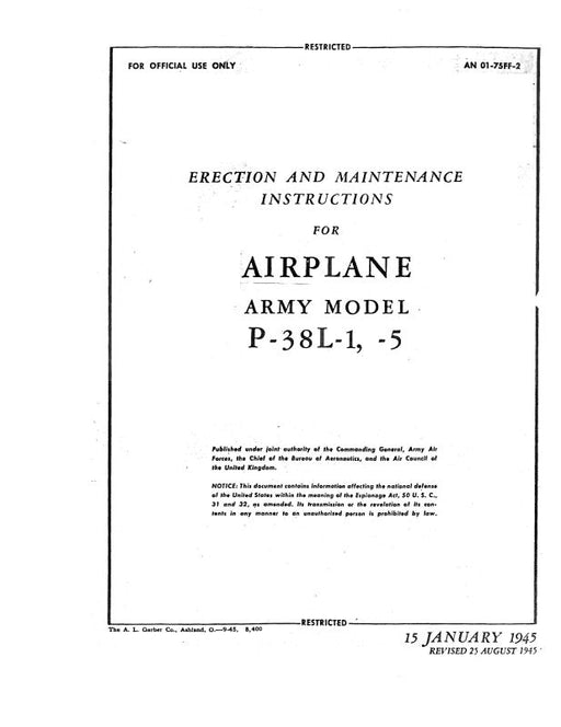 $164.00| /Lockheed P-38L-1, -5 1945 Erection & Maintenance Instructions (01-75FF-2)