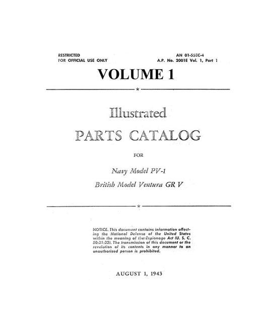 $208.00| /Lockheed PV-1 Navy Model 1943 Illustrated Parts Catalog (01-55EC-4)
