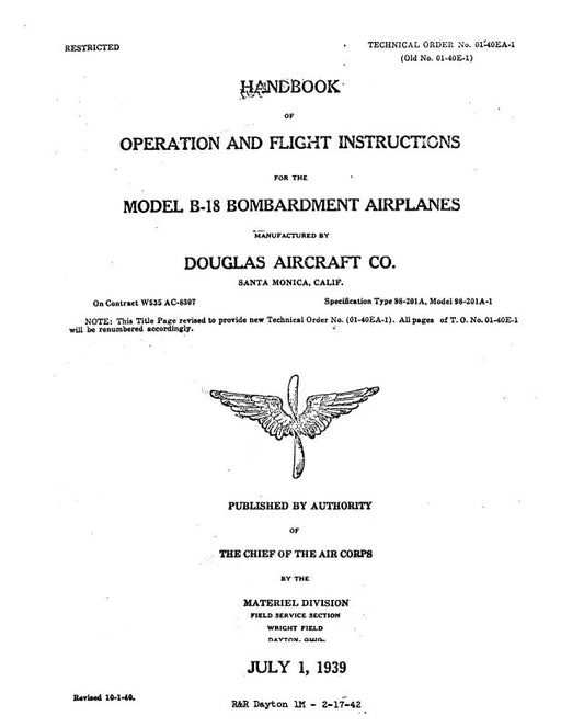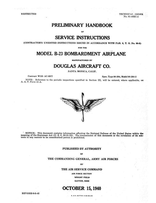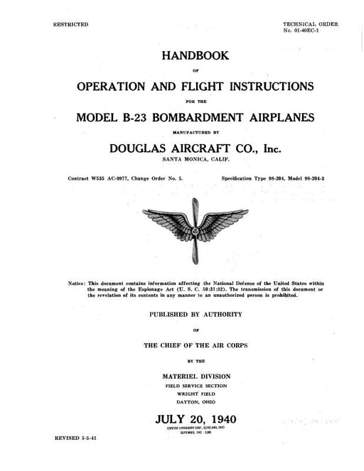 McDonnell Douglas MilitaryModel B-23 Bombardment Airplane TO 01-40EC-3 Dated Oct 15, 1940