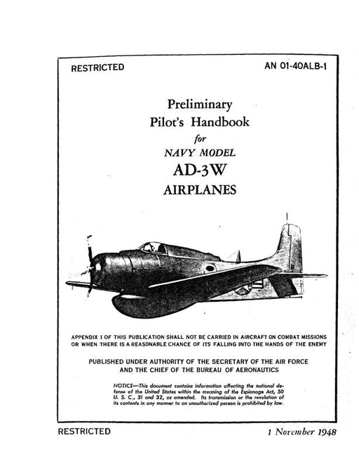 $18.00| /McDonnell Douglas AD-3W 1948 Preliminary Pilot's Handbook (01-40ALB-1)
