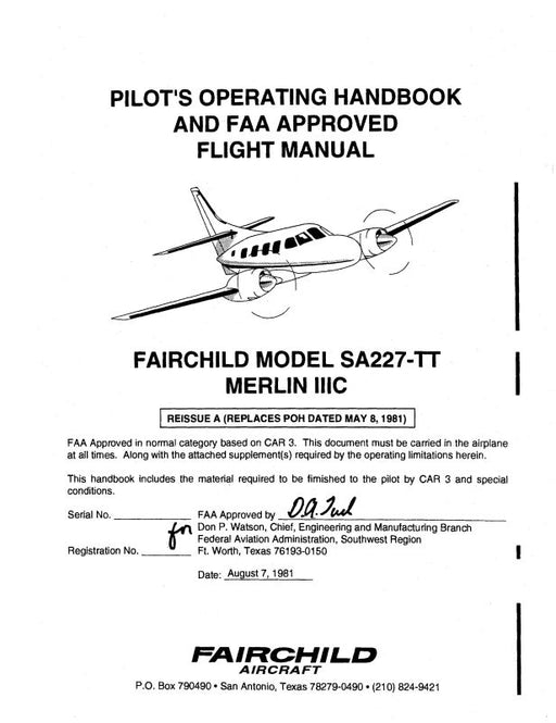 $100.00| /Merlin Aircraft SA227-TT Merlin IIIC 1981 Pilot's Operating Handbook & Flight Manual (MNSA227TT81POHC)