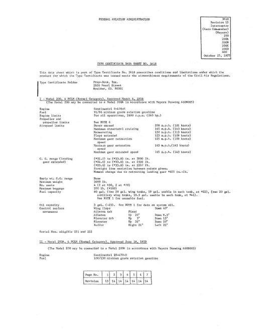 $9.00| /Meyers Aircraft Company 200,A,B,C,D,&400 Series 1977 Aircraft Specification (SPEC.-NO.-3A18)