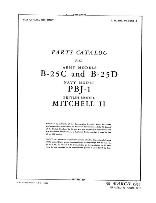 Sale $109.00| /North American B-25G & PBJ-1G 1943 Parts Catalog (01-60GC-4)North American MilitaryArmy Model B-25G Navy Model PBJ-1G Airplane Parts Catalog Dated Sept 25, 1943 T.O. No. 01-60GC-4 $109.00| /Sale