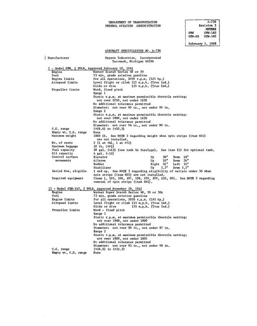 $9.00| /Meyers Aircraft Company OTW,OTW-145,KR,160 1968 Aircraft Specification (MEOTW-68-SP-C)