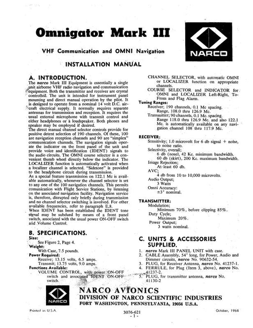 $12.00| /Narco Mark III Omnigator 1966 Installation Manual (3076-621)