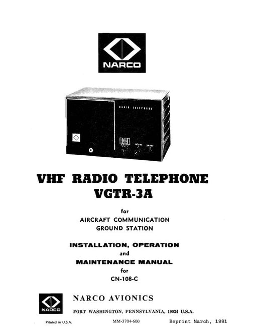 $29.00| /Narco VGTR-3A VHF 1966 Maintenance, Installation, Operation (MM-3704-600)