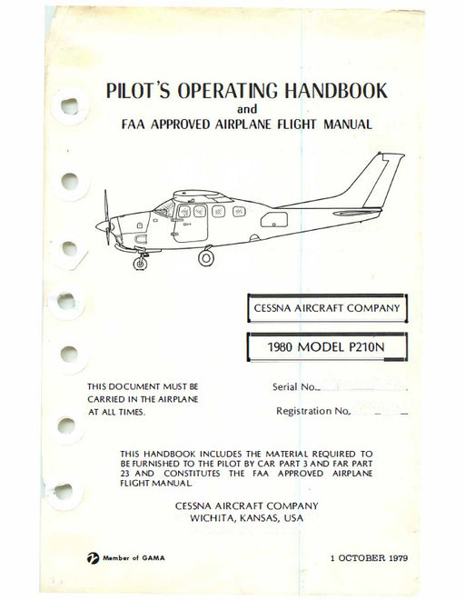 CessnaCessna P210N Pilot’s Operating Handbook & FAA Approved Airplane Flight Manual (1980 Model)This manual is the complete Pilot’s Operating Handboo...