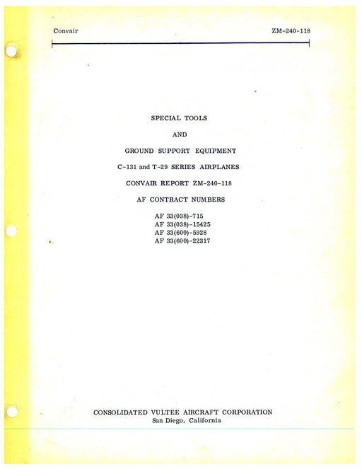 Consolidated MilitarySpecial Tools and Ground Support Equipment for C-131 and T-29 Series Airplanes - Convair Report ZM-240-118 - AF Contract Numbers - AF 33(038)-715, ...