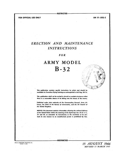 $230.00| /Consolidated B-32 Army Model 1944 Erection & Maintenance Instructions (01-5EQ-2)