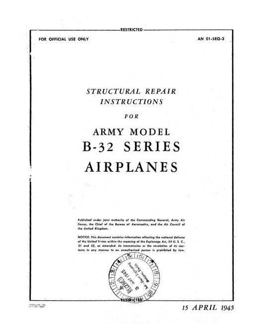 $178.00| /Consolidated B-32 Army Model 1945 Structural Repair Instructions (01-5EQ-3)