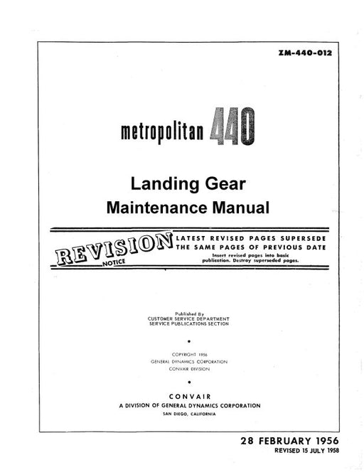 Convair AirlinersMetropolitan 440 Illustrated Parts Catalog. Dated April 1956, Revised March 1958. ZM-440-014