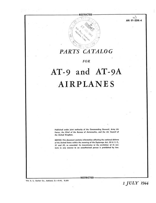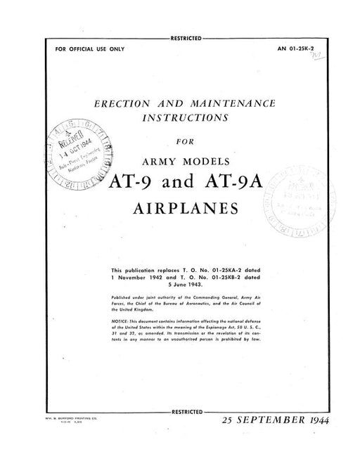 $89.00| /Curtiss-Wright AT-9 & AT-9A 1944 Erection & Maintenance Instructions (01-25K-2)
