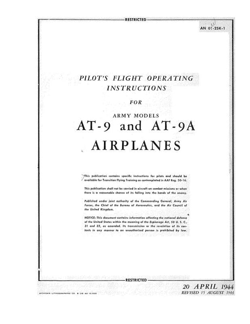 Sale $40.00| /Curtiss-Wright AT-9 & AT-9A 1944 Pilot's Flight Operating Instructions In Color (01-25K-1)
