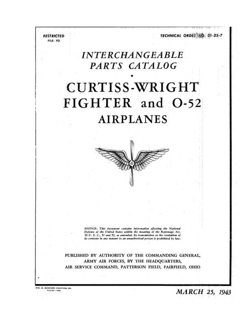 $178.00| /Curtiss-Wright Fighter & O-52 Airplanes 1943 Interchangeable Parts Catalog (1/25/2007)