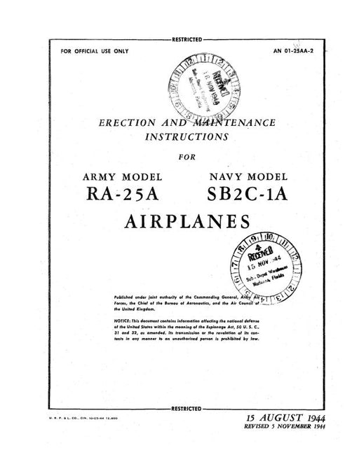 $120.00| /Curtiss-Wright RA-25A Army 1944 Erection & Maintenance Instructions (01-25AA-2)