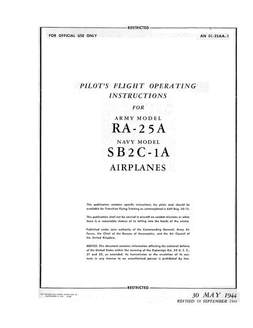 $28.00| /Curtiss-Wright RA-25A Army 1944 Pilot's Flight Operating Instructions (01-25AA-1)