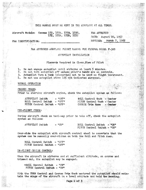 Federal AutopilotFAA approved Airplane Flight For Federal Model F-300 Autopilot Installation Aircraft Models Cessna 172, 172A, 172B, 172C, 175, 175A, 175B, 175C - D...