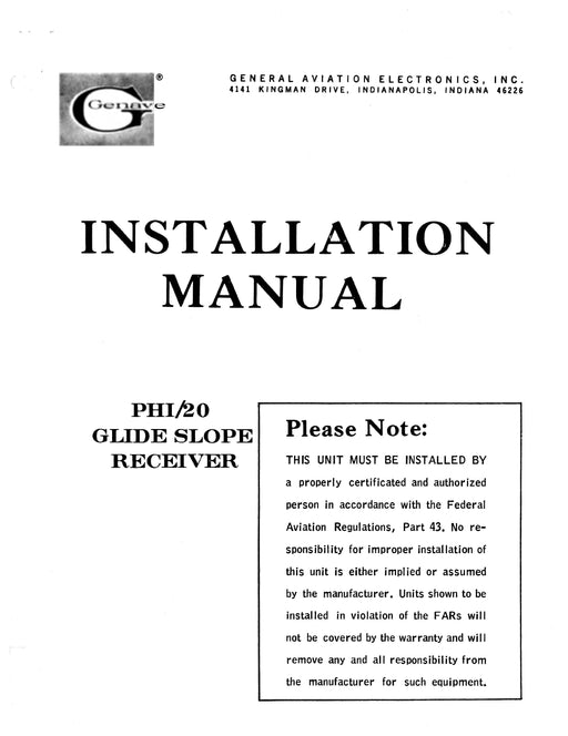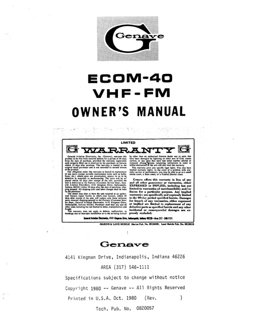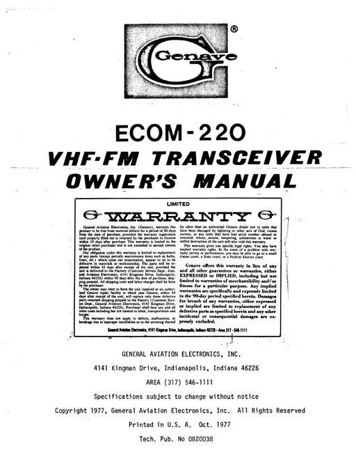 Genave, GARMINTech. Pub. No. 0540031A Contains: General Information, Installation, Operating, Maintenance, Parts List