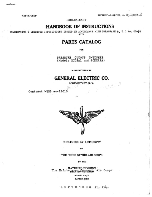 General Electric CompanyHandbook Of Instructions with Parts Catalog for Pressure Cutout Switches models 2CD2A1 and 2CD2A1A. Dated September 15, 1941. Contents: Introduct...