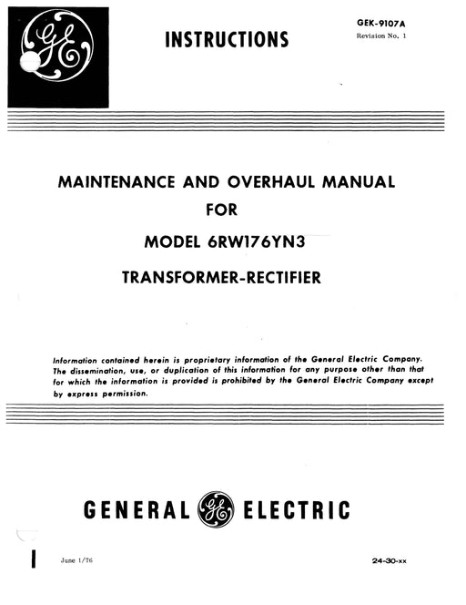 General Electric CompanyMaintenance & Overhaul for Model 6RW176YN3 Transformer-Rectifier. Dated June 1/76 Revision 1. 33 Pages GEK-9107A