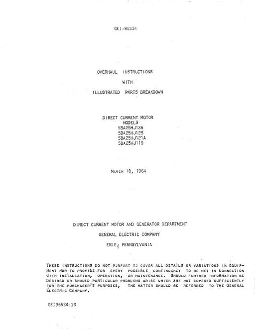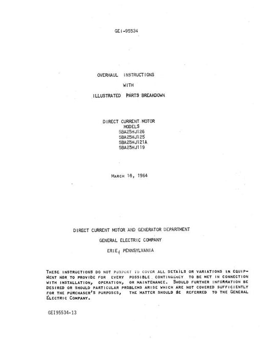 $23.00| /General Electric Company Direct Current Motors 1964 Overhaul Instructions With Illustrated Parts (GEI95534-13)