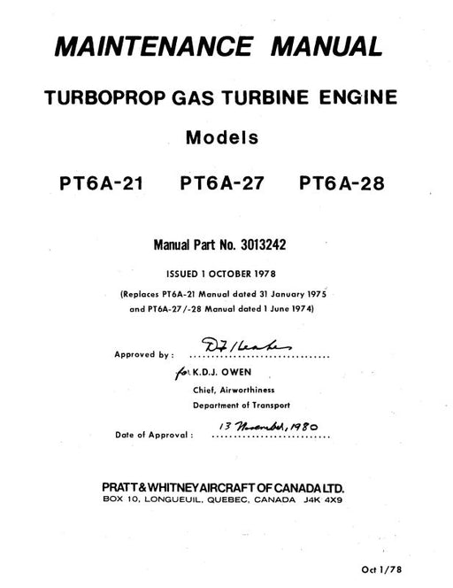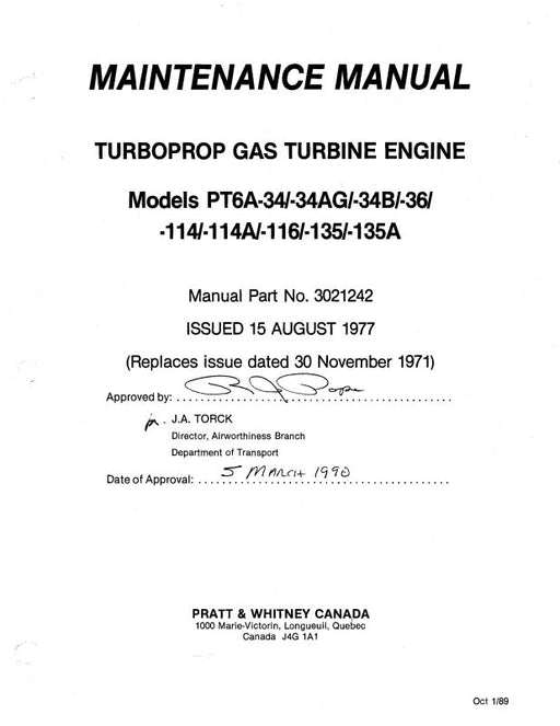 $100.00| /Pratt & Whitney Aircraft PT6A Series Models Maintenance Manual (3021242)Pratt & Whitney Aircraft EnginesPT6A-34--34AG--34B--36--114--114A--116--135--135A $100.00| /Sale