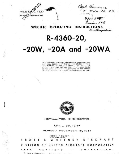 Pratt & Whitney Aircraft EnginesSpecific Operating Instructions R-4360-20, -20W, -20A and -20WA - Dated April 30, 1947 - Revised December 31, 1951 - PWA. OI. 88. 16 Pages