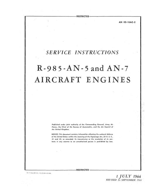 $16.00| /Pratt & Whitney Aircraft R985-AN-5 & AN-7 Service Instructions (02-10AC-2)