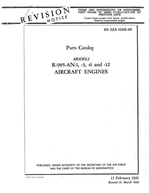 $17.00| /Pratt & Whitney Aircraft R985-AN-1,-3,-6 & -12 Parts Catalog (02A-10AB-4A)