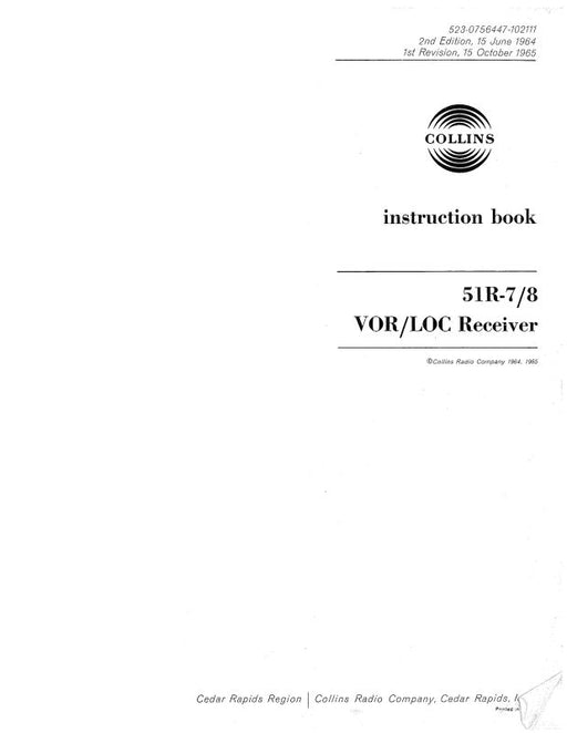 Sale $56.00| /Collins 51RV-1 VOR-ILS Receiver 1963 Overhaul Manual (523-00736003-50)Collins5th Revision, March 1968 $56.00| /Sale