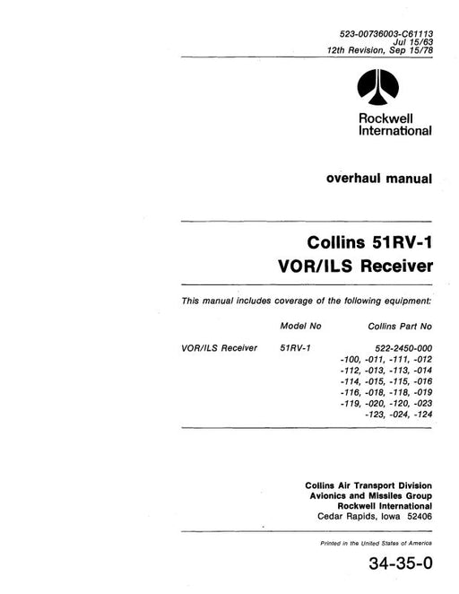 $56.00| /Collins 51RV-1 VOR-ILS Receiver 1963 Overhaul Manual (523-00736003-C6)Collins12th Revision, Sept. 1978 $56.00| /Sale