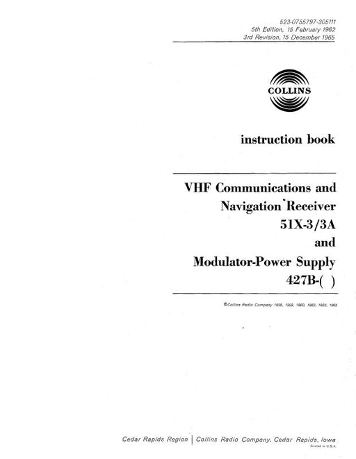 $45.00| /Collins 51X-3-3A & 427B-( ) 1962 Instruction Book (523-0755797-305)CollinsVHF Communications and Navigation Receiver 51X-3-3A and Modulator-Power Supply 427B-( ) 5th Edition, Feb. 1962 3rd Revision, Dec. 1965 $45.00| /Sale