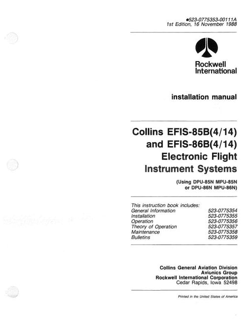 $76.00| /Collins EFIS-85B&86B (4-14) 1988 Installation Manual (523-0775353-001)