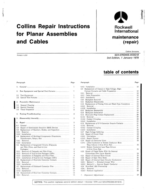 $17.00| /Collins Repair (Maintenance) Instructions for Planar Assemblies and Cables 523-0763405-003G18